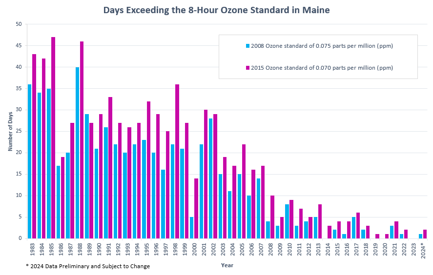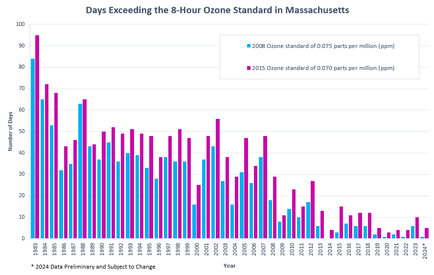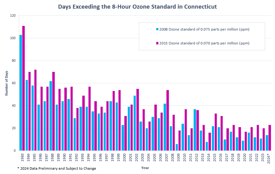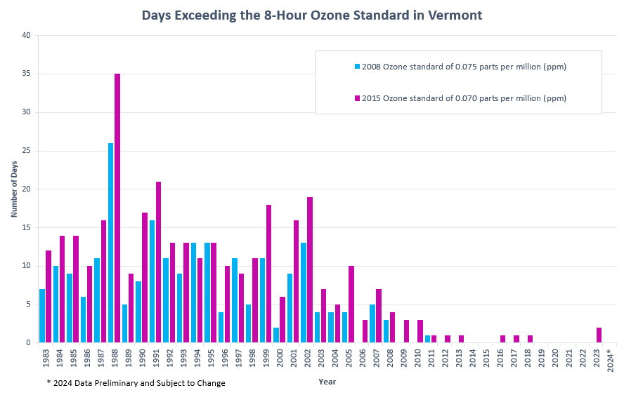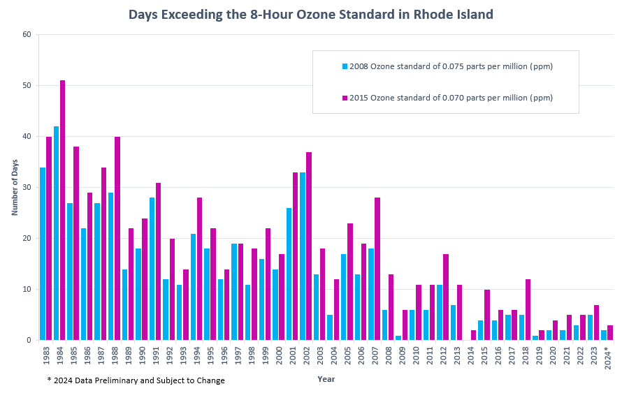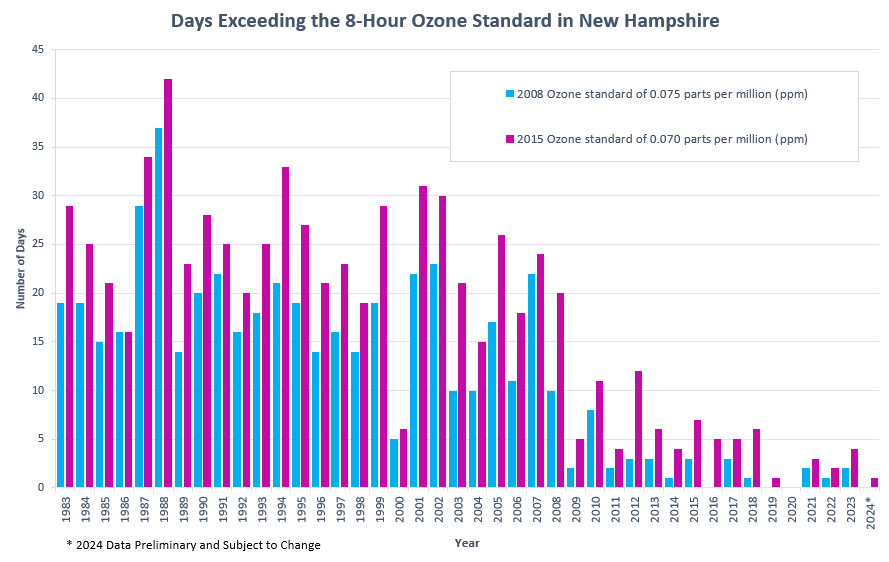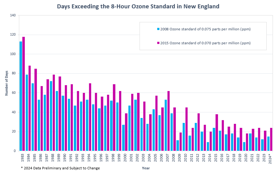 The chart below shows the number of days air quality monitors in each New England state recorded ozone concentrations exceeding the 2008 8-hour ozone standard (that is, days greater than 0.075 parts per million (ppm)), as well as the number of days exceeding the 2015 8-hour ozone standard (that is, days greater than 0.070 ppm).