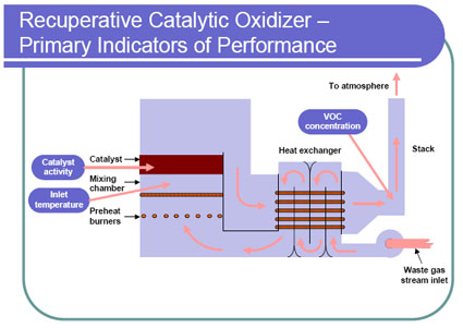 The primary indicators of catalytic oxidizer performance are the outlet VOC or volatile HAP concentration, catalyst bed inlet temperature, and catalyst activity. Other indicators of catalytic oxidizer performance include temperature rise across the catalyst bed, catalyst bed outlet temperature, outlet CO concentration, exhaust gas flow rate, fan current, outlet O2 or CO2 concentration, and pressure differential across the catalyst bed.