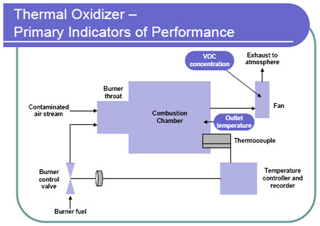 For VOC control, the primary indicators of thermal oxidizer performance are the outlet exhaust gas VOC concentration and the combustion chamber temperature. Other indicators of thermal oxidizer performance include outlet exhaust gas CO concentration, exhaust gas flow rate, fan current, outlet CO2 concentration, outlet O2 concentration, and auxiliary fuel line pressure. For CO control, the indicators of performance are the same as for VOC control, with the exception of outlet VOC and CO2 concentrations, which would not be monitored for a CO emissions limit.