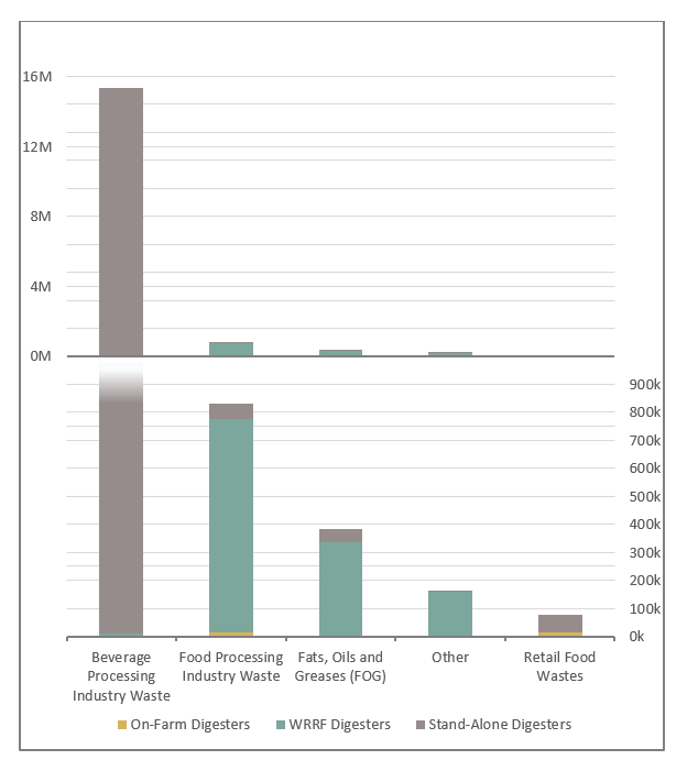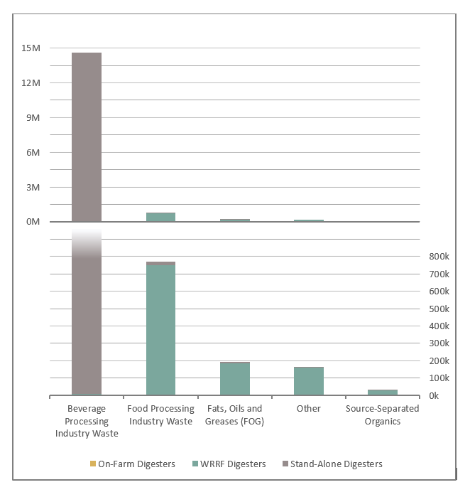 *2019 was the first year for which the granularity of data collected allowed specific densities to be assigned to specific feedstocks. For example, beverage processing industry waste was assigned the density of water (8.34 lb/gallon), higher than the density of source-separated organics and other similar food wastes (3.8 lb/gallon).