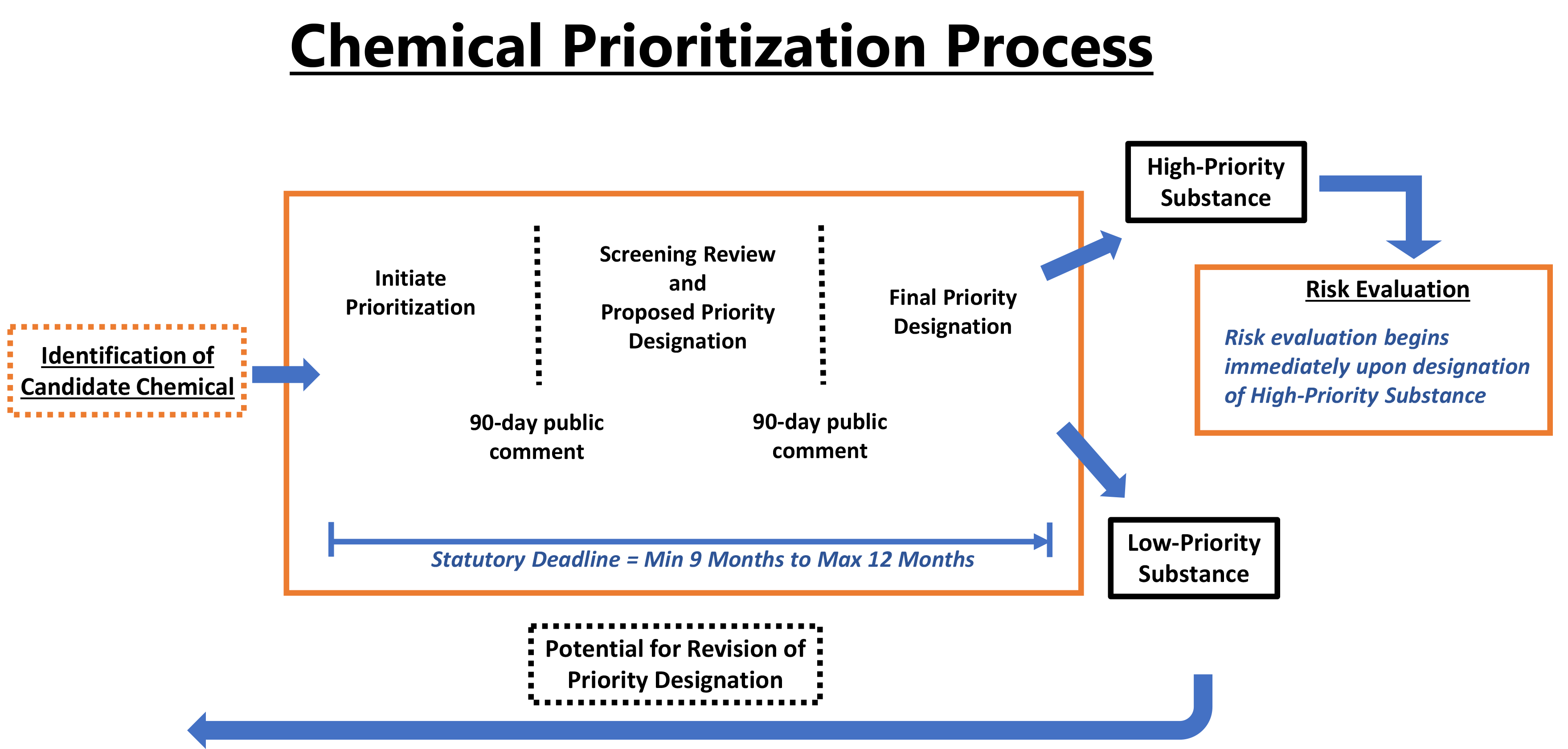 Prioritization is the initial step in the process of evaluating existing chemicals under the Toxic Substances Control Act (TSCA) and is codified in a final Chemical Prioritization Process rule. The purpose of prioritization is to designate a chemical substance as either a either high priority for immediate further risk evaluation, or low priority, for which risk evaluation is not warranted at the time.