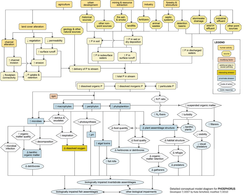 The N and P conceptual diagrams depict relationships between human activities and processes that increase nutrient levels in surface waters, and the effect of nutrient enrichment on aquatic communities. Note that nutrient enrichment itself is not shown as a proximate stressor, but affects processes and states that lead to proximate stressors (e.g., changes in dissolved oxygen or food resources) that have direct impacts on aquatic invertebrates and fish.