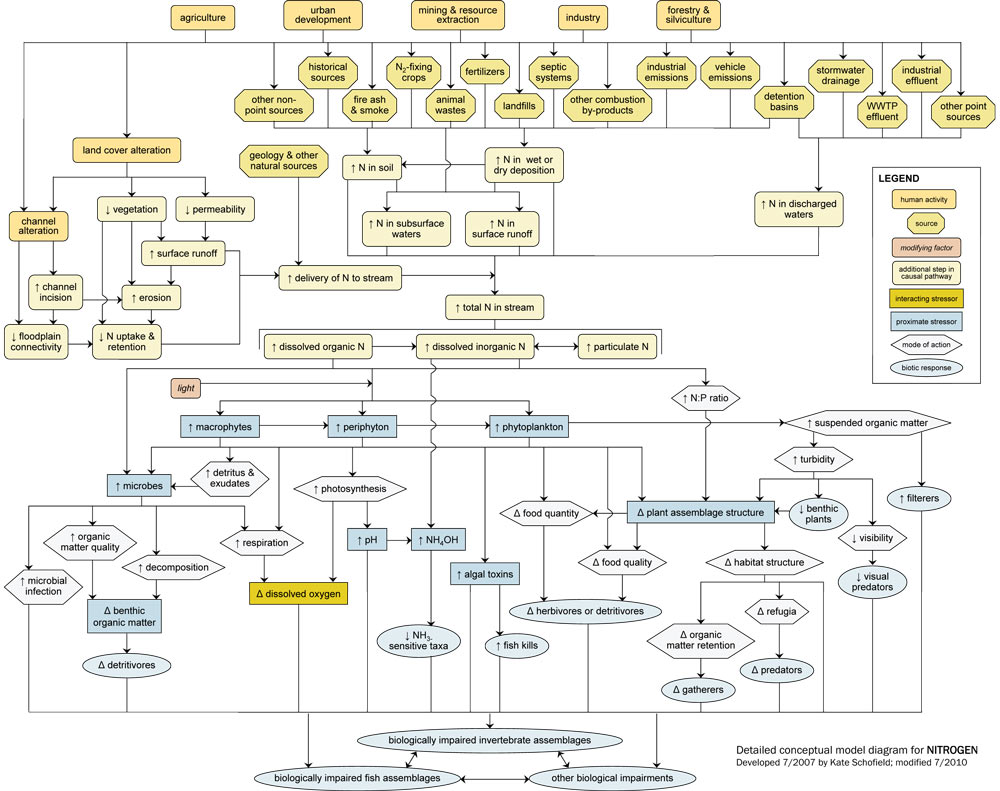 Conceptual diagrams are used to describe hypothesized relationships among sources, stressors and biotic responses within aquatic systems.