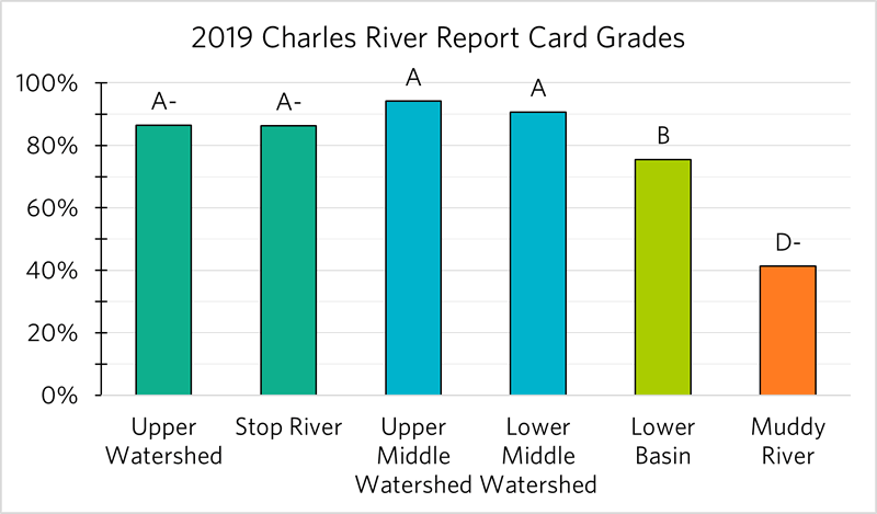 EPA has been assigning a report card grade for the lower Charles River since calendar year 1995. Beginning in 2019, grades are assigned to six individual water body segments including two tributaries. Prior to 2019, a single grade was assigned to just the lower Charles River. EPA uses the Charles River Report Card to measure and evaluate progress towards meeting the State of Massachusetts bacterial water quality standards for swimming and boating as well as to assess general health of the watershed.