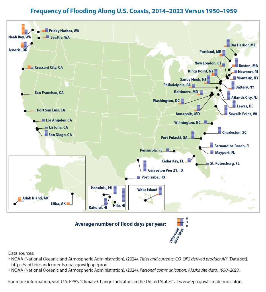- Flooding is becoming more frequent along much of the U.S. coastline. Most sites measured have experienced an increase in coastal flooding since the 1950s (Figure 1).