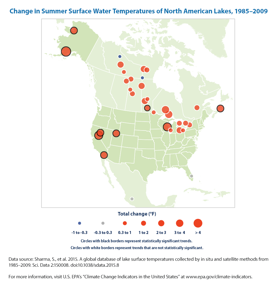 - Increases in summer water temperature throughout North America over the last three decades are consistent with other studies, such as a detailed analysis of the entire surface of each of the Great Lakes (see the Great Lakes Water Levels and Temperatures indicator).
