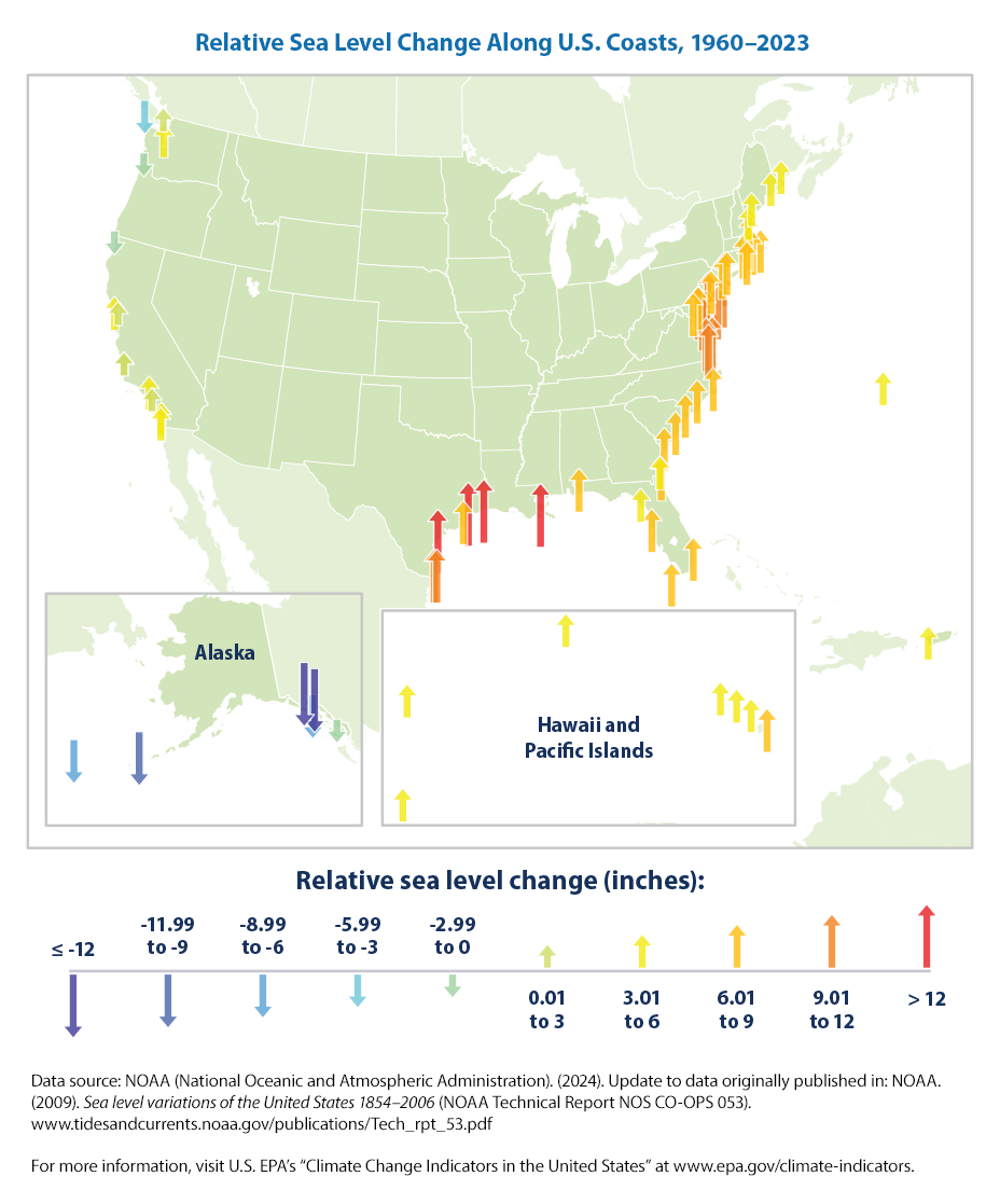 - Relative sea level rose along much of the U.S. coastline between 1960 and 2023, particularly the Mid-Atlantic coast and parts of the Gulf coast, where some stations recorded increases of more than 8 inches (Figure 2). Meanwhile, relative sea level fell at some locations in Alaska and the Pacific Northwest. At those sites, even though absolute sea level has risen, land elevation has risen more rapidly.