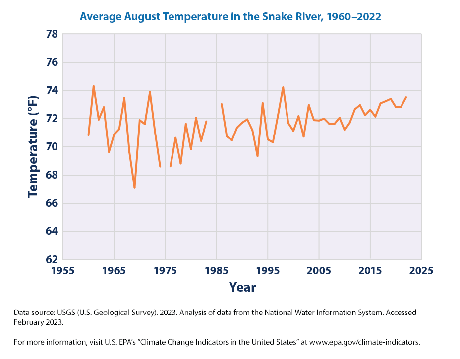 The graph shows average August water temperatures at a site in the Snake River, in eastern Washington near Nez Perce tribal lands. Several species of salmon use the Snake River to migrate and spawn. Between 1960 and 2022, water temperature has increased by 2.2°F.