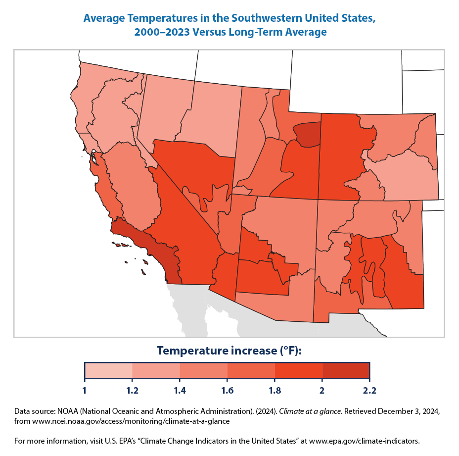 - Every part of the Southwest experienced higher average temperatures between 2000 and 2023 than the long-term average (1895–2023). Some areas were more than 2°F warmer than average (see Figure 1).