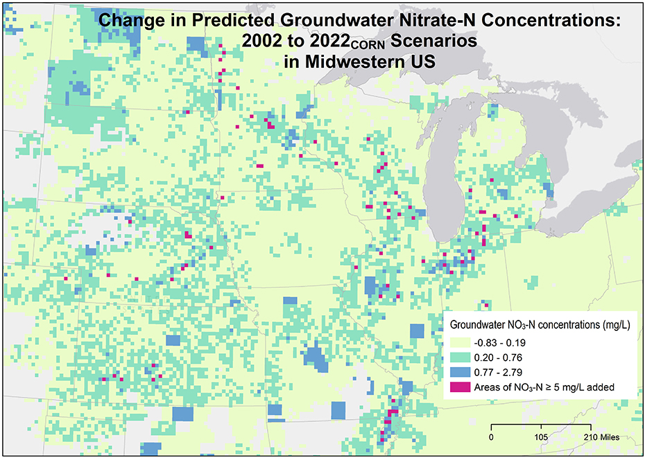 Attributing nitrogen (N) in the environment to emissions from agricultural management practices is difficult because of the complex and inter-related chemical and biological processes associated with N and its cascading effects across land, air and water. Such analyses are critical, however, in understanding the benefits and disbenefits associated with environmental management options, such as the use of corn to produce biofuels. Coupled physical models present new opportunities to understand relationships among environmental variables across multiple sources, pathways and scenarios. In this study, a coupled modeling system was used to assess the impacts of increased corn production on groundwater. In particular, the study showed how the models provide new information on the drivers for contamination in groundwater, and then relate pollutant concentration changes attributed to increased corn production between 2002 and 2022 to health and cost outcomes.