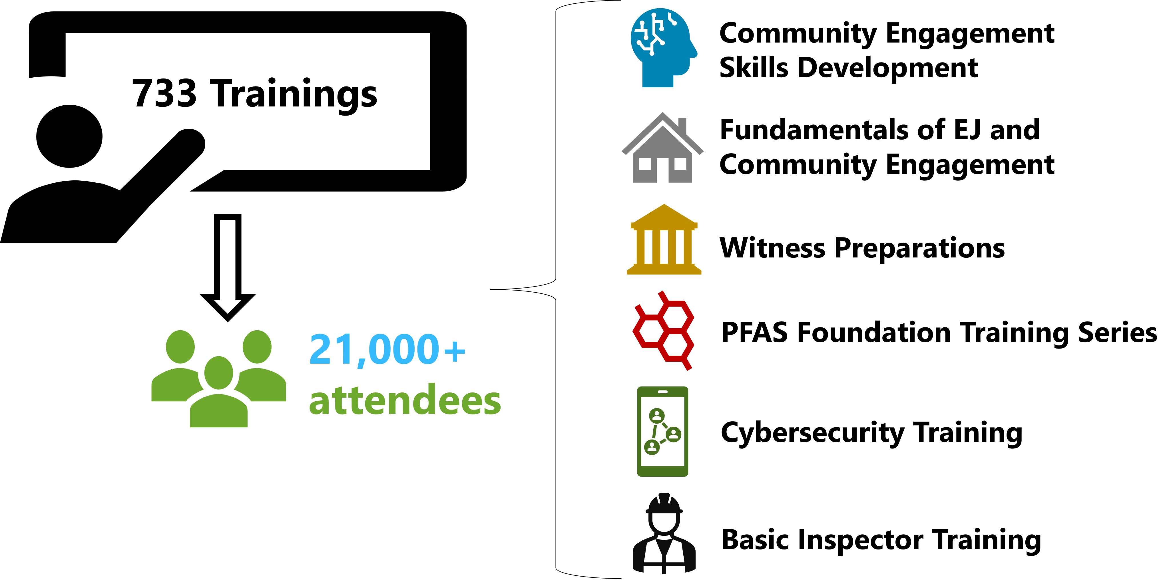 These events strengthen both EPA’s and external partners’ workforce, providing information and building capacity as they work to protect communities and advance environmental protection. In FY 2024 we provided trainings on topics such as community engagement, witness preparation and trial advocacy, climate change, and PFAS.
