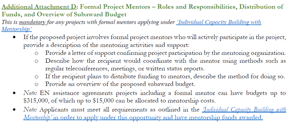 Details on this mentorship cost (so a line-item breakdown of the $15,000) should then be included in the Additional Attachment D, which is mandatory for applicants applying with a formal mentor. Please see the four sub-bullets under the first bullet, below.