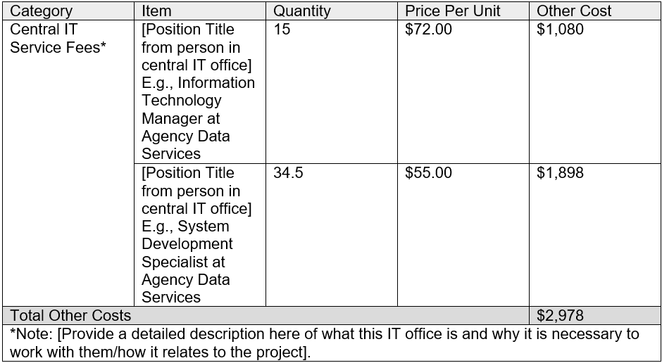 In a case where the costs for this central IT cost are structured per staff position, and not as a lump sum, the table would look like this instead. Please note that, as this differs from the typical ‘other’ cost category table format, this can be added as a second table within that section of the budget narrative attachment form: