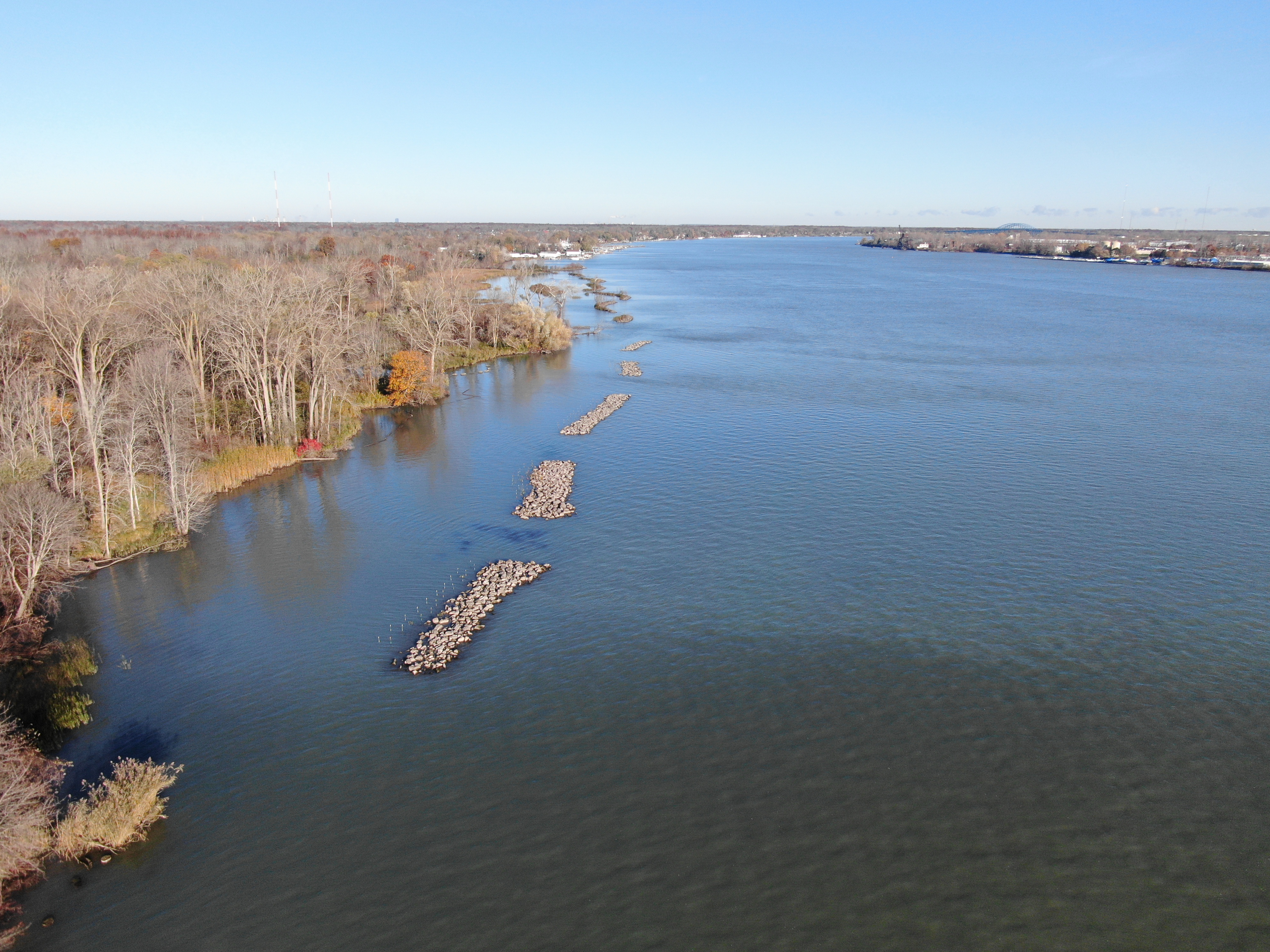 The New York State Parks, Recreation and Historic Preservation (NYSPRHP) received Great Lakes Restoration Initiative (GLRI) funding in 2003 to expand on improvements to the East River Marsh. The East River Marsh Project area faced several challenges including shoreline erosion, loss of habitat, lack of wetlands along the river’s edge, and few places for fish and wildlife to breed. This project was completed the summer of 2019 and included the installation of five rock reefs that will protect the shoreline, stabilize riverbanks, and reduce erosion. This will encourage submerged and emergent vegetation growth and expand river wetland habitats.