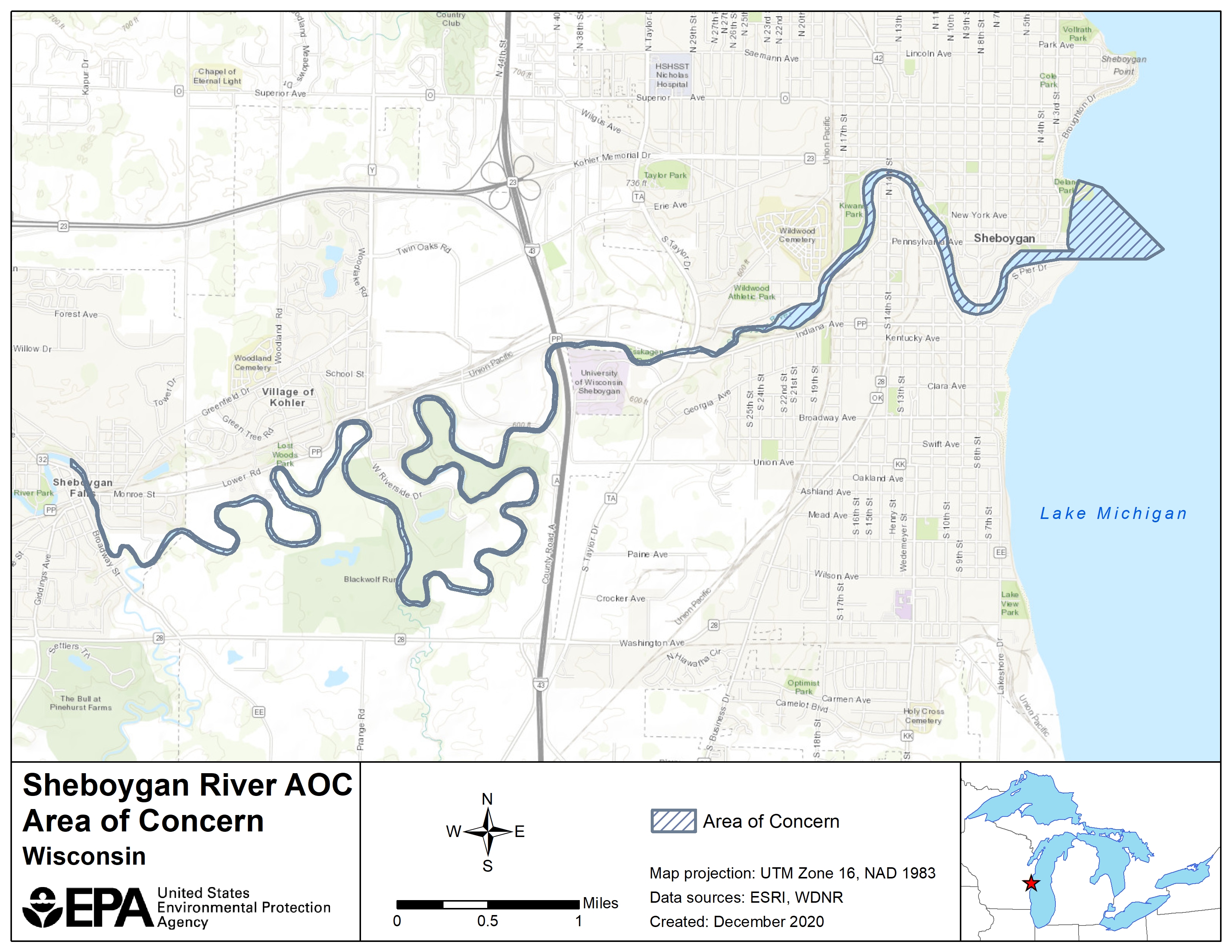 The Sheboygan River is an 81-mile long river that flows through Fond du Lac, Sheboygan, Calumet, and Manitowoc counties in eastern Wisconsin before discharging into Lake Michigan in the city of Sheboygan. The Sheboygan River AOC encompasses 14 miles of the lower Sheboygan River downstream from the Sheboygan Falls Dam and includes the entire harbor and nearshore water of Lake Michigan.