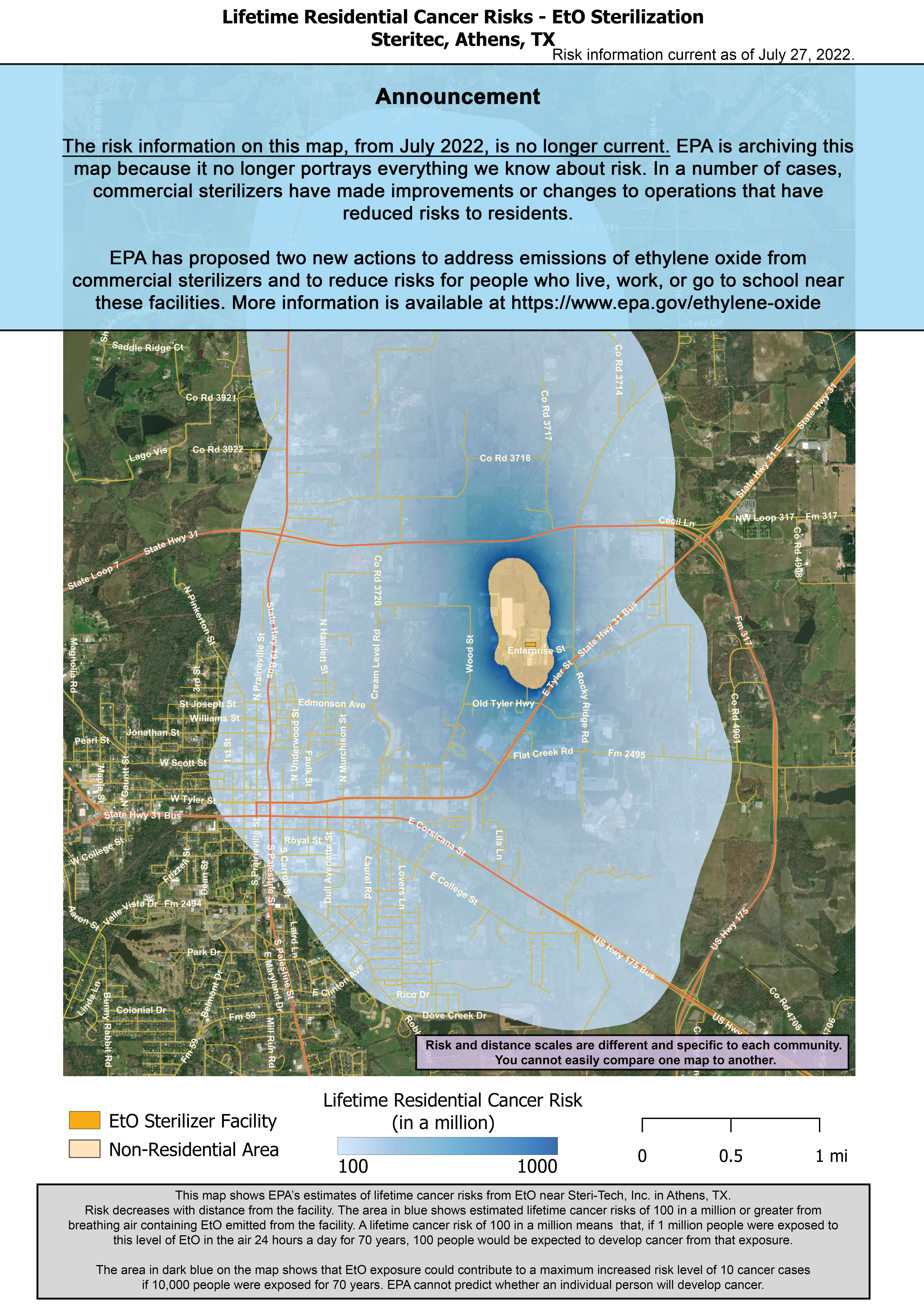 Este mapa muestra las estimaciones de la EPA de los riesgos de padecer cáncer de por vida debido al uso de EtO cerca de Steritec, Inc. en Athens, TX. Como puede observar en el mapa, el riesgo disminuye en la medida en que se mantenga una distancia con respecto a la instalación.