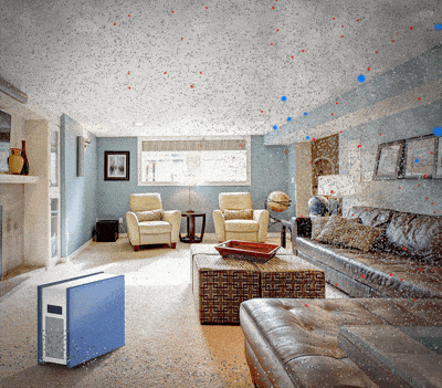Click on the images below to see an animation of a portable air cleaner removing particles from the air in a home.