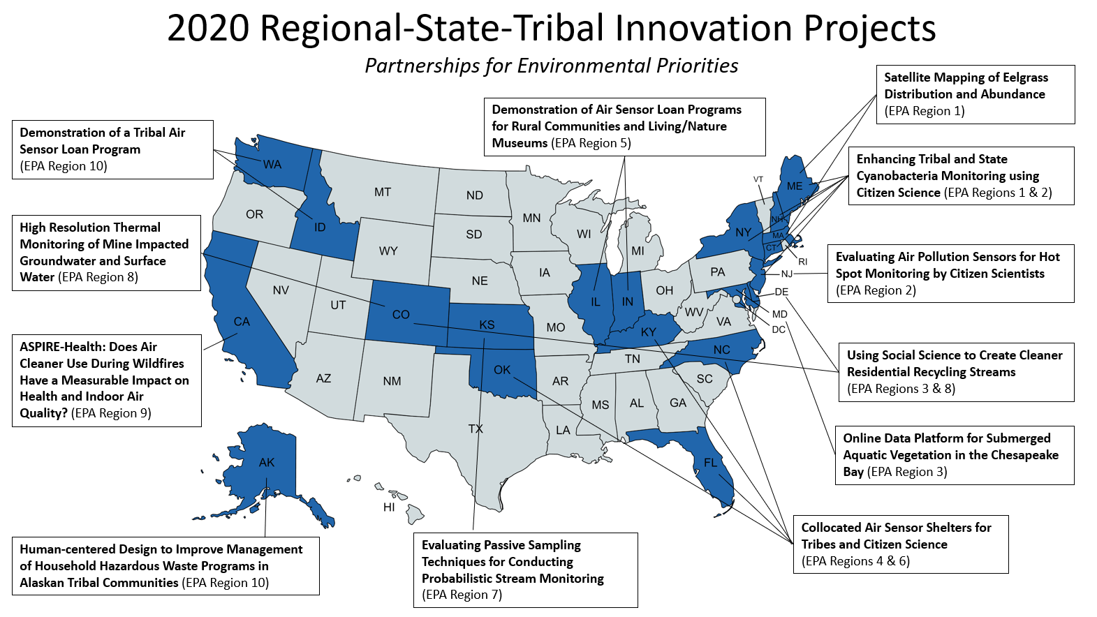 EPA’s Office of Research and Development (ORD) provided an opportunity for the EPA Regions to submit proposals for innovative projects to address state and tribal science priorities. This year, we are excited to fund 12 projects that use innovative approaches to address high priority issues while partnering with states and tribes. These projects will engage 19 state partners and 20 tribal partners. The work will address a wide range of environmental challenges from how to create cleaner residential recycling streams to better monitoring approaches for air and water pollution. Find out more information about the projects below.