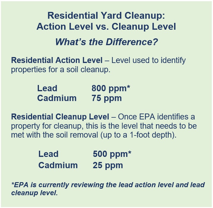 The lead action level for the site was selected in the late 1990s. It was based on EPA guidance in effect at that time and derived from modeling that used a blood lead level of 10 micrograms per deciliter (µg/dL) as the level of concern. Evidence from more recent scientific studies show that blood lead levels below 10 µg/dL may also cause negative health impacts.