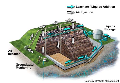 A bioreactor landfill is a municipal solid waste landfill (MSWLF) in which liquids are added to help bacteria break down the waste. The increase in waste degradation and stabilization is accomplished through the addition of liquid and air to enhance microbial processes. This bioreactor concept differs from the traditional “dry tomb” municipal landfill approach.