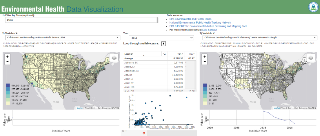 Dr. Sala N. Senkayi is the acting Regional Quality Assurance Manager in EPA Region 6 and has spent her career finding ways to visualize data in academia and the U.S. Environmental Protection Agency (EPA). In 2016, Dr. Senkayi used EPA's new Qlik Sense data visualization platform to visualize health and environmental data provided by the Centers for Disease Control and Prevention (CDC). In 2017, she received the Presidential Early Career Award for Scientists and Engineers (PECASE). She has used the funding that came with this award to continue collaborating with others on visualizing data. Since 2017, she has worked with EPA Office of Research and Development (ORD) contractor Dr. Bryan Chastain and subject matter experts in New Zealand to develop a Region 6 app/tool, the Environmental Health Data Visualization tool/app (EHD app). The tool allows environmental professionals to visualize tabular data and relationships and also uses GIS to provide insights into spatial interactions between varying variables.