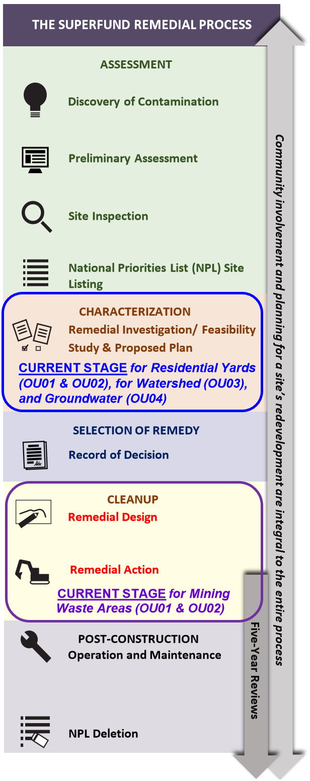• Residential Yards: Since 1999, EPA has cleaned up over 300 residential yards (under an ongoing Removal Action). EPA is conducting a Remedial Investigation and Feasibility Study (RI/FS) to figure out the best way to address lead contamination of residential yards and child high-use areas (child care centers, parks and playgrounds) throughout the site. Once completed, EPA will publish a Proposed Plan and seek public input. Contact EPA today for more information about this free testing and cleanup opportunity!