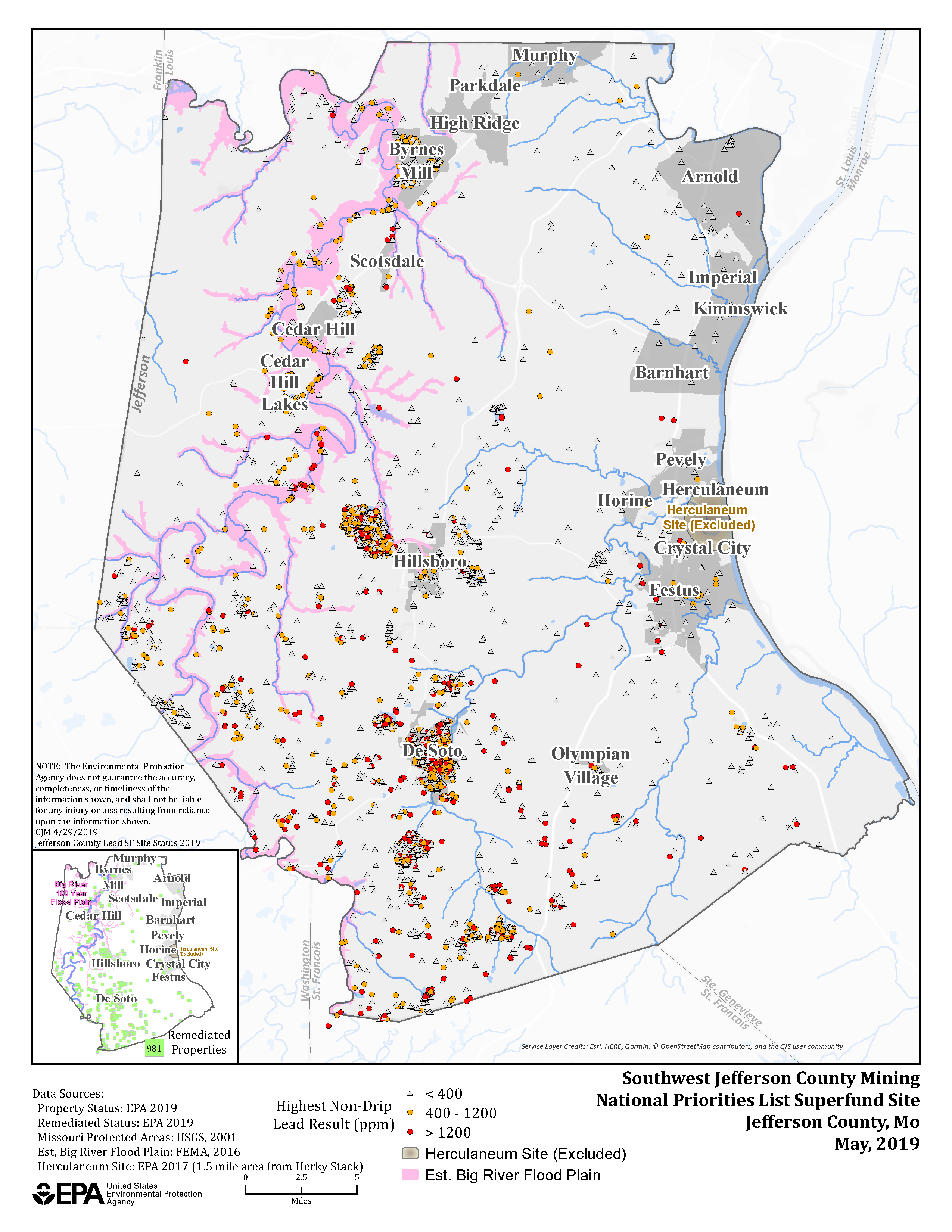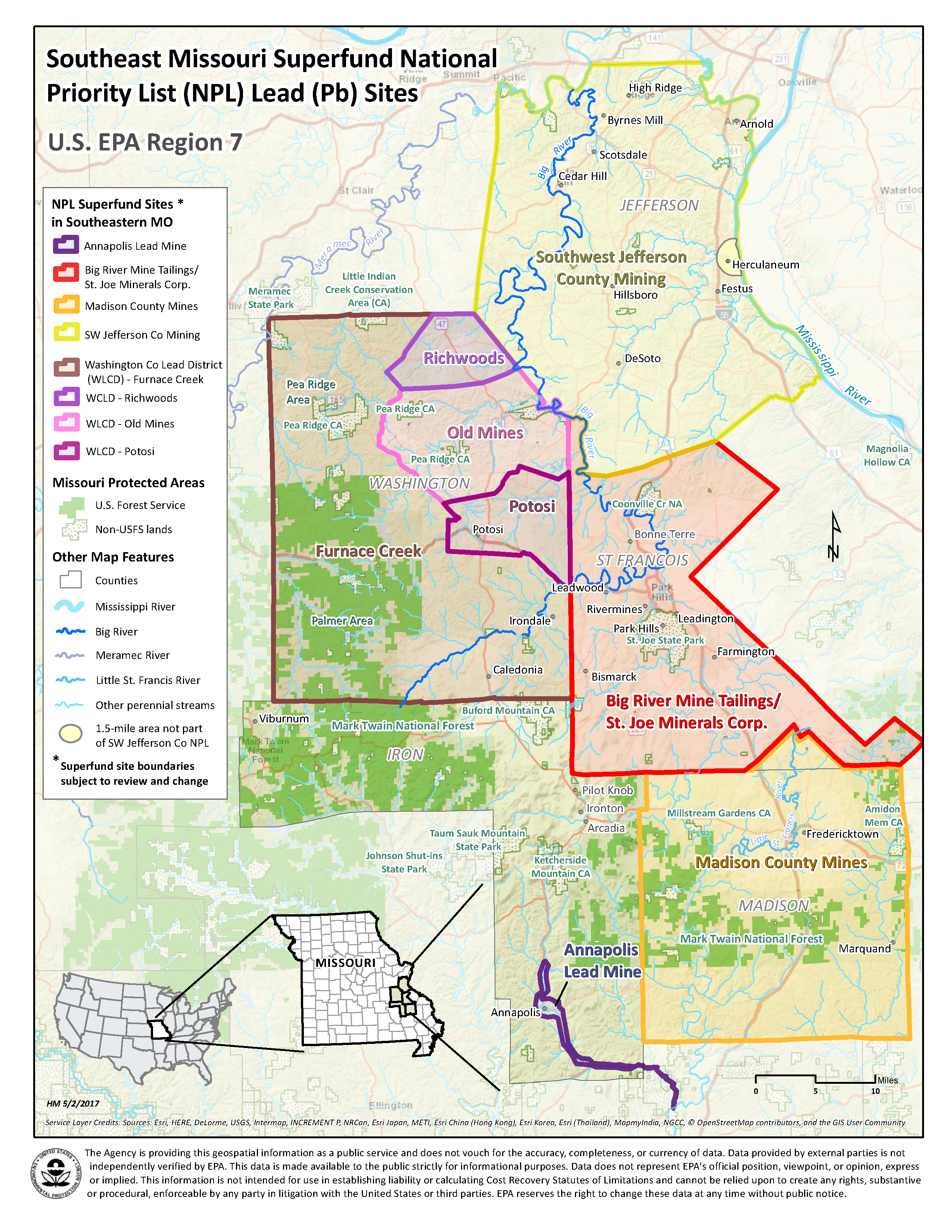 - Fact Sheet, May 2019: Lead Testing and Cleanup Opportunity, Residential Soils and Private Drinking Water Wells, Remedial Actions at the Site; Southwest Jefferson County Mining National Priority List (NPL) Superfund Site, Jefferson County, Missouri
