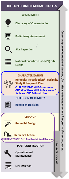 EPA is completing a Remedial Investigation (RI) and Feasibility Study (FS) to address potential lead contamination in private, domestic drinking water wells across the site. (See remedial process diagram at right.)