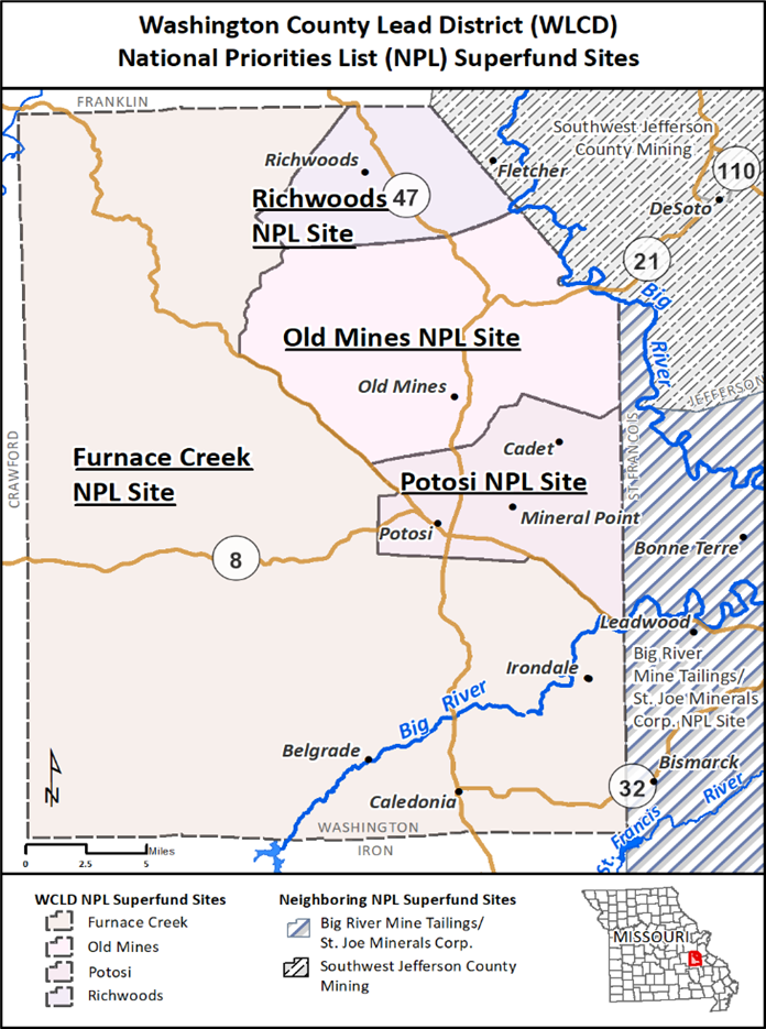 The U.S. Environmental Protection Agency (EPA) Region 7 is seeking public input on four Proposed Plans (plans) to address lead and other heavy metal contamination in private, domestic drinking water wells at residential properties within the Washington County Lead District (WCLD) National Priorities List (NPL) Superfund Sites. The four NPL Superfund Sites covering the Washington County Lead District include: Furnace Creek, Old Mines, Potosi and Richwoods. (See three site maps at right.)