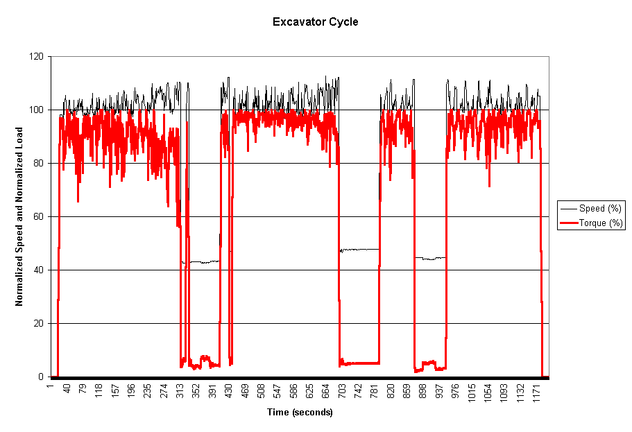 Engine Speed and Torque vs Time (Normalized 0 = idle; 100 = rated/governed central speed/torque)