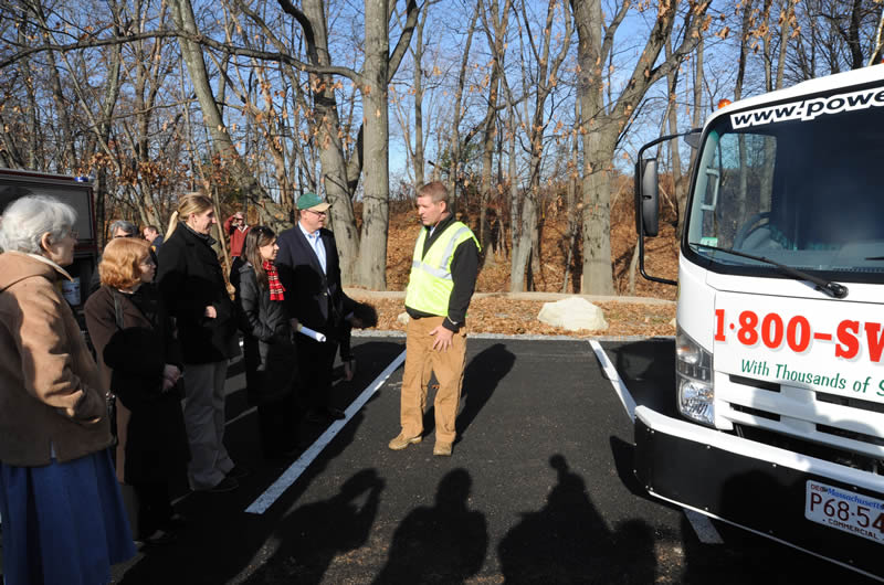 Rainwater and snow melt runs off the surface of traditional pavement and carries pollutants to our water ways. Porous pavement lets water infiltrate into the soil through gaps in all the layers to the groundwater. It also filters pollutants from stormwater and helps protect the water quality of Mill Brook. Since optimum performance of porous pavement depends on these air spaces, sand should not be used in the winter. Porous pavement must be vacuumed (not swept) clean to avoid clogging. Watch the video below to learn more about the porous pavement project on Hurd Field.