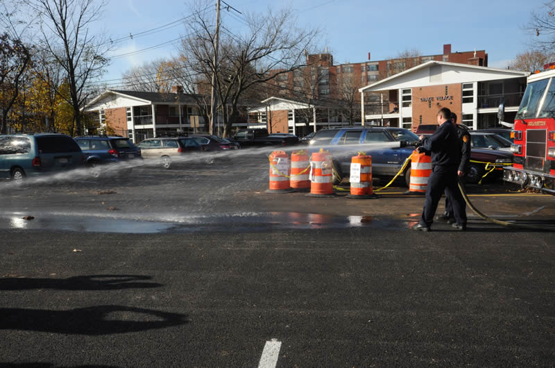 Arlington Fire Department uses a firehose to demonstrate water infiltration through the porous pavement.