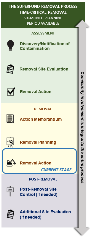 EPA initiated a time-critical removal action for the PCB contamination in the building in November 2021 and removed the spilled PCB-containing oils and electrical equipment. During this removal, EPA also identified many abandoned containers suspected to hold hazardous substances, as well as presumed asbestos-containing materials (PACM) throughout the building. As of February 2022, EPA has begun an assessment of those containers and PACM to determine an appropriate method of removal and disposal for those items.