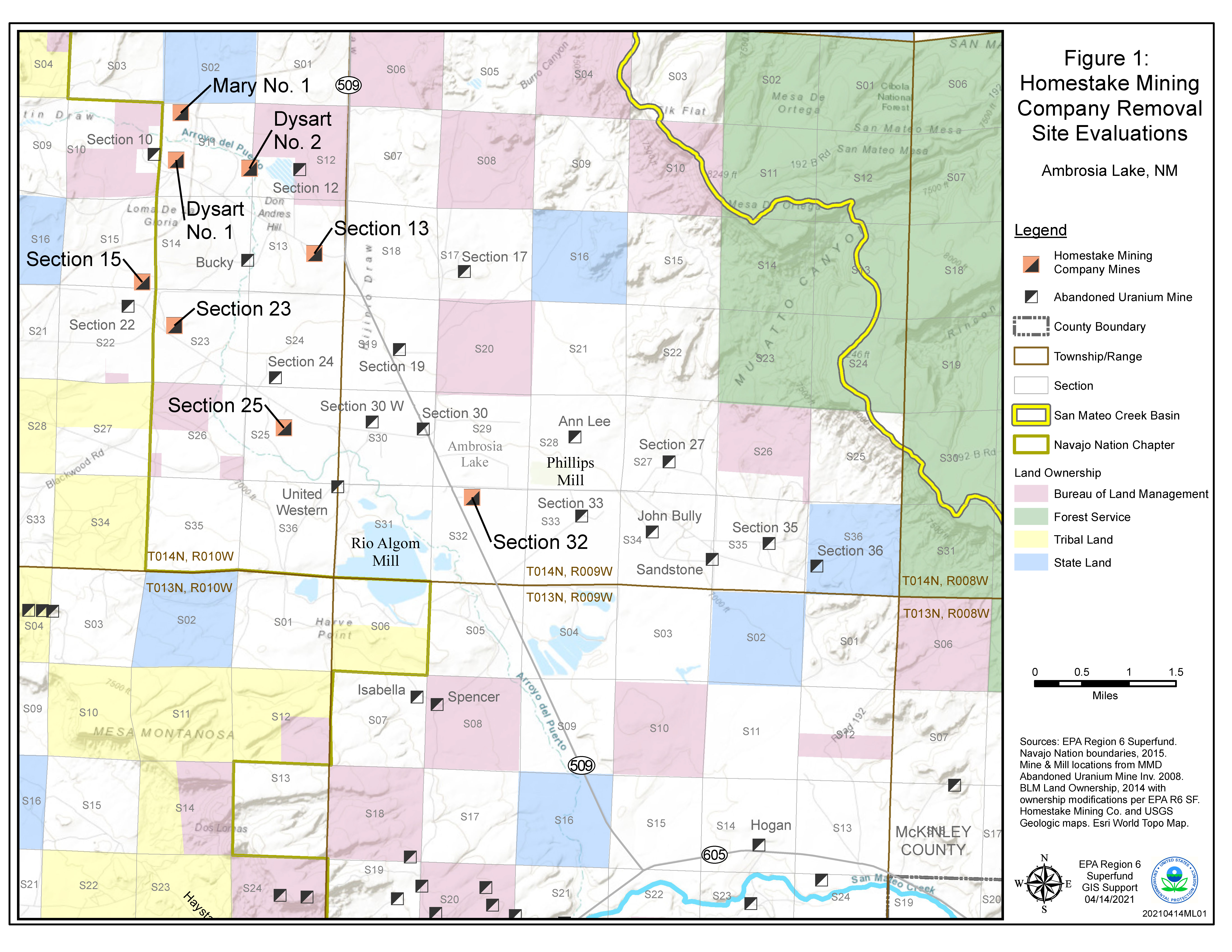 The EPA and Homestake Mining Company reached an agreement in September 2021 for the company to conduct Removal Site Evaluations (RSEs) at eight mines in the Ambrosia Lake region of the San Mateo Creek Basin. The RSEs identify the nature and extent of contamination from legacy uranium mining at the mines. The RSE report will assist EPA in determining if an Engineering Evaluation/Cost Analysis  (EE/CA) for a non-time critical removal action is needed to address risk to human health and the environment.