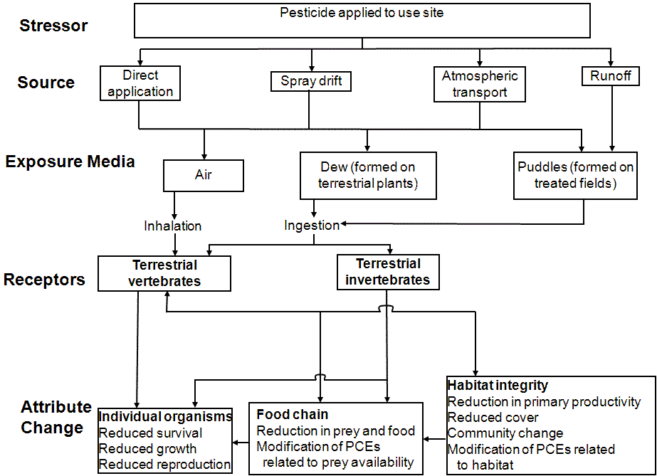 The conceptual model specifies the potential routes of exposure, biological receptor types, and effects endpoints of potential concern. Examples of conceptual models are provided in Figures 1 (generic aquatic exposure pathways), 2 (generic terrestrial exposure pathways), and 3 (terrestrial exposure specific for drinking water ingestion and inhalation). (An electronic copy of these figures can be found on the G Drive under Policies, Guidance, and Formats\Formats\Review Actions\Problem Formulation\Conceptual Model Formats.) These examples are intended to be generic in scope, and representative of major routes of potential exposure for aquatic and terrestrial receptors including runoff and spray drift. Further description of the major routes of aquatic and terrestrial exposure routinely considered in ecological risk assessments completed by EFED is provided in the Overview Document (USEPA,2004). Both models consider direct and indirect effects to listed and non-listed species, as well as consideration of the Primary Constituent Elements (PCEs) associated with designated critical habitat for listed species. Microsoft® PowerPoint files of the conceptual models, which should be modified prior to incorporation in the problem formulation, are provided as an attachment to this guidance memo.
