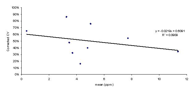 Relationship between mean and corrected CVs of empirical dataAn individual field was simulated by randomly selecting a mean and a CV from the distributions of means and CVs from the study data (Figure B.2). A Monte Carlo simulation was then conducted using Crystal Ball TM 2000 (v.5.1) where 10,000 random values were generated for each field and the summary statistics and percentiles were calculated. This procedure was repeated 99 more times to generate distributions of initial residues on 100 fields (Figure B.3). Table B.4 presents the mean, median and 90th percentile of the means, CVs, and various percentiles (specifically: 5th, 10th, 25th, 50th, 75th, 90th, and 95th) of the 100 simulated fields.