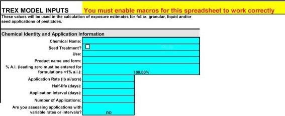 Application Rate* Enter the maximum label application rate (pounds a.i./acre). If your application rate has already been adjusted for active ingredient, make sure you have entered 100 in the % a.i. cell above; otherwise, enter your application rate in lbs formulation/A here and then the % a.i. in the product in the above cell. Foliar Dissipation Half-life* Enter the foliar dissipation half-life in days. See Appendix A for guidance on determining the appropriate value for this parameter. The default chemical half-life is 35 days. Application Interval*a Enter the minimum interval (days) between multiple applications (if any). Note: This version of the model can only accommodate uniform application intervals; subsequent models may incorporate a provision of intervals of varying length. The risk assessor may evaluate the effect of using application intervals other than the minimum interval on the label to explore the effects of possible mitigation options on risk outcomes. Number of Applications*a Enter the number of applications. EFED policy states that screening-risk assessments should consider the maximum number of applications specified on the product label. However, the risk assessor may elect other numbers of applications to explore the effects of possible mitigation efforts on risk outcomes. Are you assessing applications with variable rates or intervals?*a Enter "yes" or "no". If "yes" is selected, you will enter the rate and intervals in Cells F6-35 and G6-35. You will not need to enter an application rate, interval or number of applications in Cells B11, B13 or B14. If "no" is selected, enter an application rate, interval and number of applications in Cells B11, B13 or B14. NOTE: "Clicking" the "reset model" button to the right of the first set of inputs will clear ALL of the user-supplied information. This button was included to allow the user to run multiple scenarios more quickly with T-REX without having to manually clear each cell.