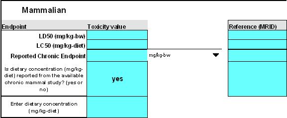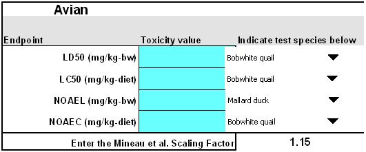 To calculate risk quotients, user-supplied avian and mammalian toxicity endpoints need to be entered into the "Endpoints" section of the Inputs worksheet. These endpoints can be found in avian acute oral LD50, avian acute dietary LC50, avian reproduction NOAEC/L, acute mammalian LD50 or LC50, and mammalian reproduction NOAEC/L toxicity studies.
