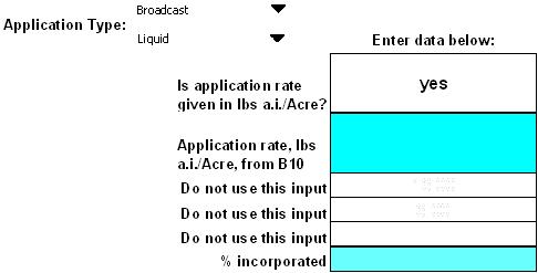 Depending on the combination of application method chosen and characteristics of formulated product, the user will be prompted to enter the appropriate data in the blue cells located below and to the right of the drop-down menus (cells D61, D63 through D65). For broadcast applications of granular products, the user does not need to enter any additional information on the "inputs" page. However, if the product is a liquid applied as a broadcast spray or is a liquid or granular and is applied in rows, then additional information is needed. Guidance for entering data for each type of application is provided in Table 2-1 below. The user should pay attention to the units being requested for each input.
