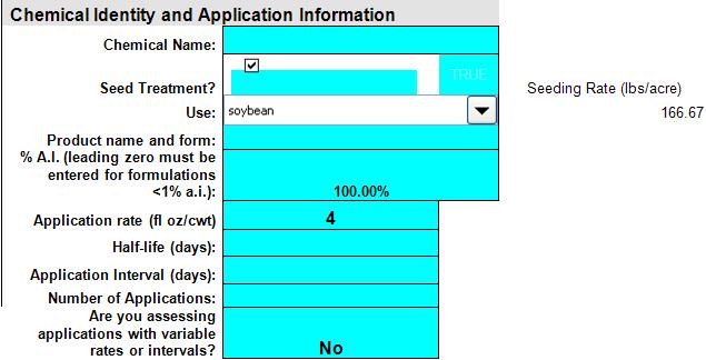 T-REX Inputs Input Name Input Description Chemical name Enter either the chemical or common name used in the assessment. Seed treatment? Click on the box if you are assessing a seed treatment. If not, you do not need to select anything in this cell. Use Enter the type of use (e.g., turf, residential, crop, foliar, right-of-way, etc.) If applicable, also provide crop name. Product name and form Enter the name of the formulated product as it appears on the subject label, including any indication of the form of the product (e.g., 10g — 10% granular, wp — wettable powder, etc.) % A.I.* If an application rate for a formulated product is used, enter the % a.i. for the formulation. However, if the application rate has already been adjusted for % a.i., use 100%.