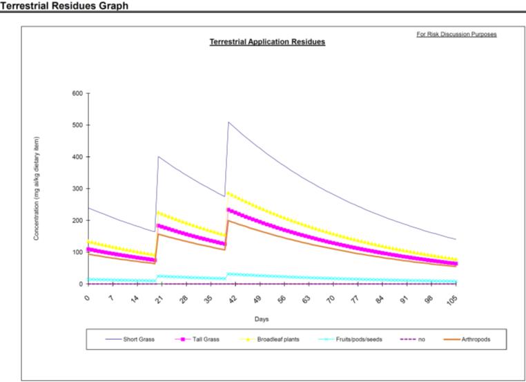 The spreadsheet calculates the pesticide residue concentrations on each selected food item on a daily interval for one year. When multiple applications are modeled, residue concentrations resulting from the final application and remaining residue from previous applications are summed. The maximum concentration calculated (out of the 365 days) is returned as the EEC used to estimate potential risk to birds and mammals as described below. Dissipation of a chemical applied to foliar surfaces for single or multiple applications is calculated assuming a first-order decay rate from the following first-order rate equation: