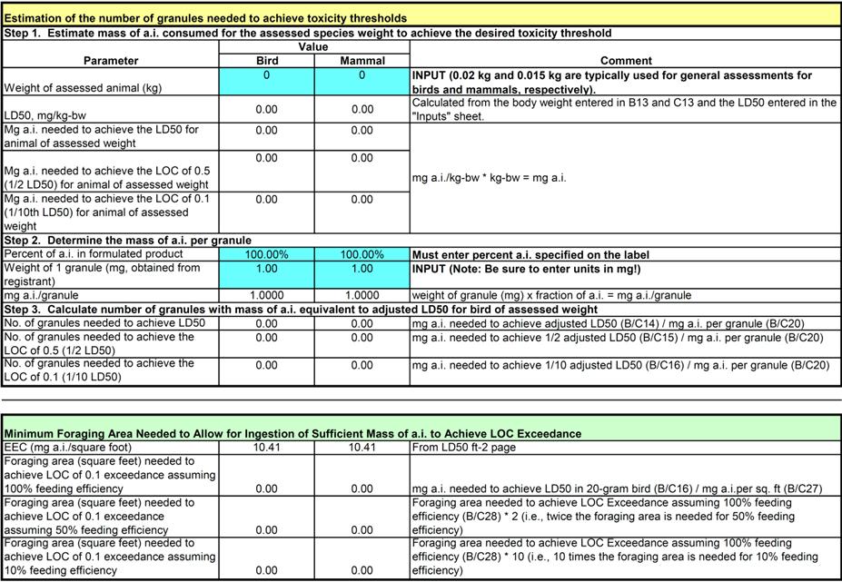 T-REX includes the capability to calculate the LD50 ft-2 risk index values with the user supplied information (Figure 2-4). Conceptually, an LD50 ft-2 is the amount of a pesticide estimated to kill 50% of exposed animals in each square foot of applied area. Although a square foot does not have defined ecological relevance, and any unit area could be used, risk presumably increases as the LD50/ft2 value increases. The LD50/ft2 value is used to estimate risk for granular formulations and row, banded, and in-furrow applications. For additional information on the LD50 ft-2 risk index, please refer to USEPA (1992). The LD50 ft-2 value is calculated using a toxicity value (adjusted LD50) and the EEC (mg a.i. ft-2) and is directly compared with the Agency's levels-of-concern (LOCs). Additional toxicity data are not needed for this calculation; however, additional information may be needed to allow for calculation of the exposure index (mg a.i./ft2). These data are described below.