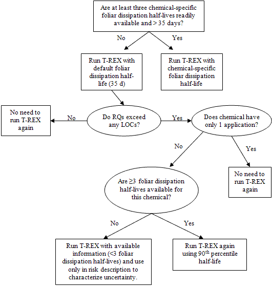 If no RQs exceed the LOCs and there are no data to suggest that the foliar dissipation half-life may be above 35 days, the risk assessor does not need to re-run T-REX. Figure A.1 provides a decision framework for when to collect chemical-specific foliar dissipation half-lives.