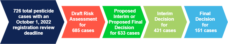 The U.S. Environmental Protection Agency (EPA) is sharing an update on its progress in meeting the Oct. 1, 2022, Federal Insecticide, Fungicide, and Rodenticide Act (FIFRA) pesticide registration review deadline for the 726 pesticide cases registered before October 2007. Pesticides without finalized review as of this deadline can remain on the market and be used according to the product label. EPA affirms its aggressive plan to review all remaining pesticide cases and issue decisions to protect humans, endangered species, and the environment, while providing pesticide users with predictability about the legal status of pesticides in registration review.
