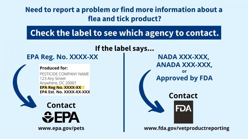If you need to report a problem or find more information about a flea or tick product, start by checking the product label to see which agency to contact.