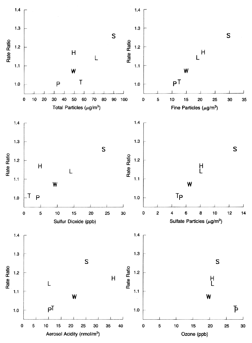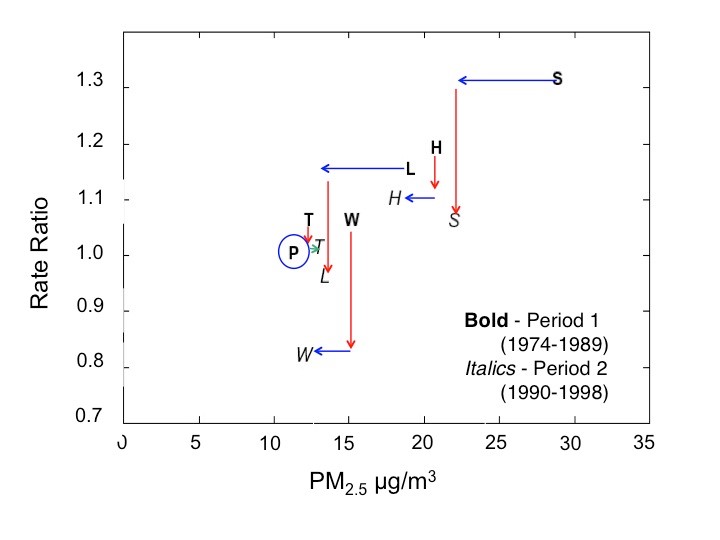 The Harvard Six Cities Study found statistically significant associations between chronic exposure to air pollution and mortality (Figure 7), specifically for fine particles and other pollutants strongly correlated with fine particles. Air pollution was also positively associated with cardiopulmonary disease deaths. A follow-up study (Laden et al., 2006) assessing risk of death after considerable improvement in air quality in these six cities showed that the risk of mortality diminished in proportion to the reduction in air pollution. As shown in Figure 8, the mortality rate ratio decreased in each city as air quality improved.