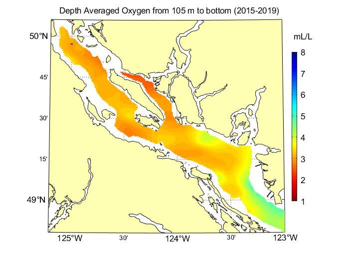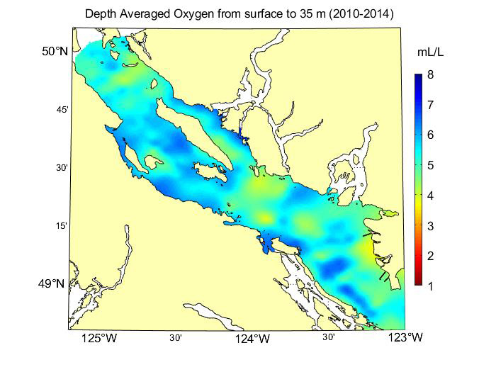 It is noteworthy that average dissolved oxygen measurements in the Strait of Georgia tend to be approximately 1.5-2mL/L lower than average dissolved oxygen measurements in Puget Sound, within the same depth profile. This phenomenon occurs due to several processes. First, the Strait of Georgia occasionally experiences a natural influx of low-oxygen Pacific water that flows over a sill at Boundary Pass at the southern end of the Strait. This influx spreads throughout the Strait and contributes to lower levels of dissolved oxygen. Second, Puget Sound often experiences vigorous vertical mixing due to strong tidal currents near the Admiralty Sill, and in the Tacoma Narrows, which leads to higher dissolved oxygen levels at depth. Finally, Puget Sound frequently experiences super-saturation of dissolved oxygen in the surface layer during the summer due to high primary productivity, which contributes to higher average dissolved oxygen levels at the surface.