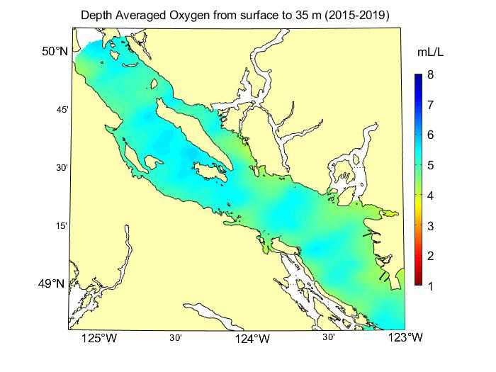 The charts below show dissolved oxygen data collected in the Strait of Georgia between 2010 and 2019 at three depth intervals: 0-35m, 35-105m, and 105m to the sea bottom. At depths between 0-35m, the dissolved oxygen levels vary more widely due to oxygen exchange with both the atmosphere and biological processes. At greater depths, the dissolved oxygen levels are more stable. The maps below display a spatial interpolation of dissolved oxygen throughout the Strait of Georgia from 2010-2014 and from 2015-2019 at the three established depth intervals. The oxygen data range for the maps is from 1 mL/L to 8 mL/L. The data used to create the charts and maps were quality controlled at the Institute of Ocean Sciences in Sidney, BC.