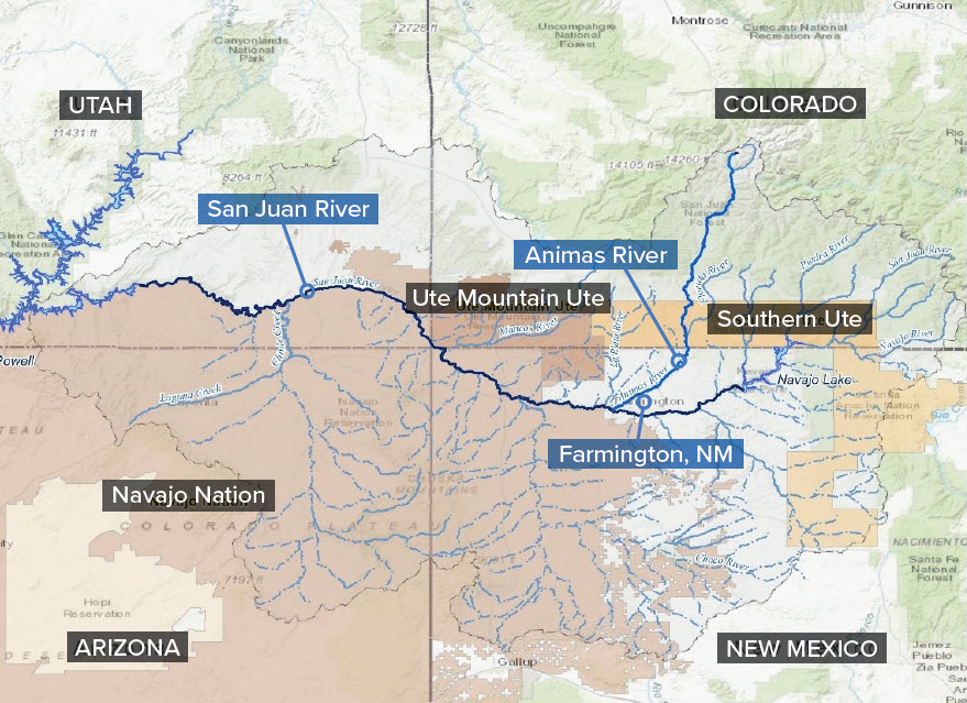map showing the location of the San Juan River along the borders of Colorado, New Mexico, Utah, and Arizona