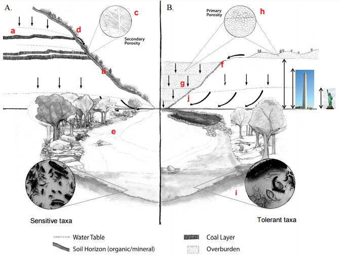 Infiltration though valley fills of water exposed to larger total surface area of porous unweathered rock (h) produces higher channelized flows and higher concentrations of dissolved ions and trace metals downstream, where biological communities shift towards tolerant taxaa grouping of organisms given a formal taxonomic name such as species, genus, family, etc. (i).